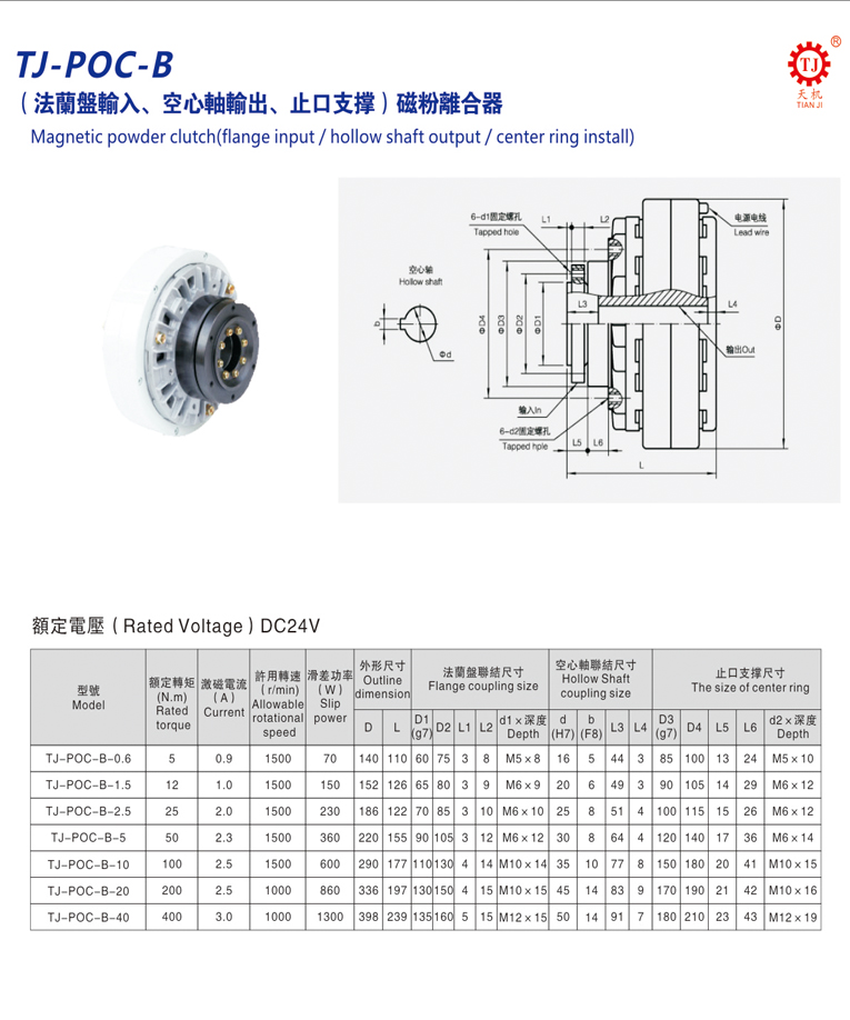空心軸磁粉離合器(內(nèi)殼旋轉(zhuǎn)磁粉離合器)產(chǎn)品說(shuō)明:TJ-POC-B磁粉離合器的工作原理與TJ-POC磁粉離合器系列的工作原理是一樣的。TJ-POC-B系列空心軸輸出磁粉離合器采用圈靜止,雖然采用的是自然冷卻方式,由于在輸入旋轉(zhuǎn)端的外周部配置了散熱片及動(dòng)作面,自然冷卻效果好優(yōu)越性。它以磁粉為工作介質(zhì),以激磁電流為控制手段,達(dá)到控制制動(dòng)或傳遞轉(zhuǎn)鉅的目的。其輸出轉(zhuǎn)鉅與激磁電流呈良好的線(xiàn)性關(guān)系而與轉(zhuǎn)速或滑差無(wú)關(guān),并具有響應(yīng)速度快結(jié)構(gòu)簡(jiǎn)單等優(yōu)點(diǎn)。