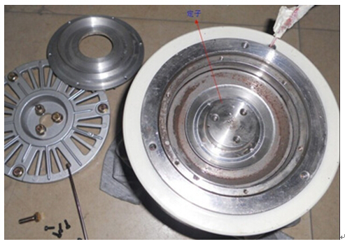 2、 然后用準(zhǔn)備好的工具將磁粉制動(dòng)器端蓋的固定螺栓以及定子固定螺栓擰開,將端蓋取出后,再將擋蓋的幾個(gè)固定螺栓擰開并取下?lián)跎w,然后再取出定子。取出定子后,看到就是轉(zhuǎn)子,里面放置就是磁粉(微顆粒狀)。